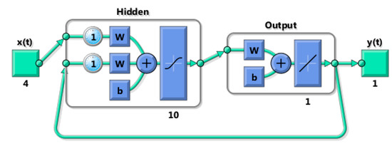 We used a three-layer network to learn the EWH model, which consists of an input layer, a hidden layer, one output layer, and one feedback connection from the output of the network to the input of the network. The input layer consists of five inputs represented by X shown in Equation (2), which also includes the feedback input. The hidden layer has 10 neurons. The output layer gives or predicts the water temperature of the tank at the next time slot. In this paper, a Levenberg–Marquardt method was used as the training method to train the network. The NARX structure of the network generated by using MATLAB Neural Network toolbox is shown by Figure 3.