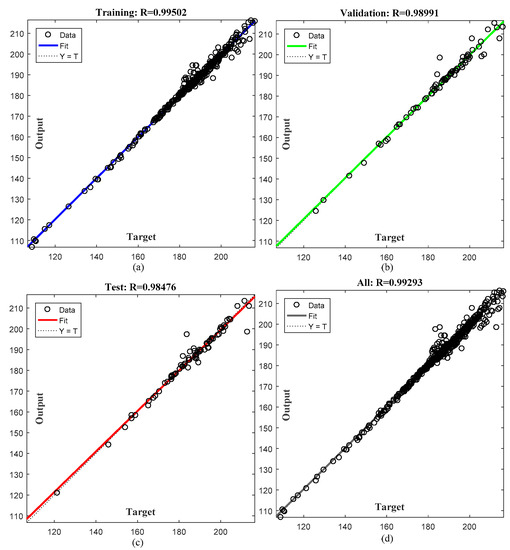 NARX training performance for: (a) training dataset; (b) validation dataset; (c) test dataset; and (d) overall dataset.