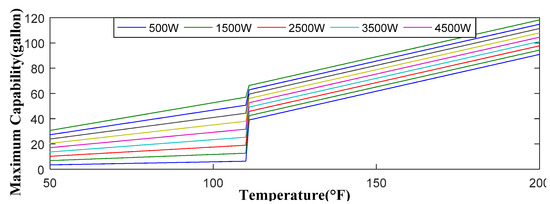 Thus, considering the above factors, Wmax can be calculated using Equations (6)–(8). The maximum capability we can have given different tank temperature and input power with Tbase equal to 110 °F is shown in Figure 5.
