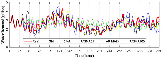In addition, the residential hot water consumption pattern has a lot of uncertainty due to stochastic events such as guest visiting, vacations, etc., thus many studies affirmed the inability to model and predict domestic hot water consumption [18,19,20]. To overcome these challenges, [17,20] used models that have multi-function prediction. Inspired by these models, this paper uses a time series decomposition forecasting methods, seasonal autoregressive integrated moving average (ARIMA) to forecast customer water demand pattern. The seasonal ARIMA (p,d,q) (P,D,Q)m model is a well-established modeling technique that combines autoregressive (AR) part, moving average (MA) part and integrated (I) part of a prediction progress where parameters p, d, and q are non-negative integers representing the order of the AR model, degree of difference and the order of the MA model. Comparatively, parameters P, D, and Q are seasonal AR, MA and I parts of the model. In addition, m refers to the number of periods in each season. Figure 6 shows the performance of five forecasting methods given the real public load forecasting data from Global Energy Forecasting Competition 2014 (GEFCom2014). It includes Seasonal mean method, MA method, ARIMA (3,1,1) with seasonal MA, ARIMA (1,1,1) (1,0,2)24 and ARIMA (1,1,2) (1,0,0)168. The fourth and fifth methods are chosen from the optimal methods in [17]. The red line is the target load data from GEFCom2014, it has a two peaks in each 24 h interval and also a long term tide. All five forecast methods can follow the two peaks but they all have error to some extent in forecasting the long term load tide. The initial learning week is not shown in the figure.