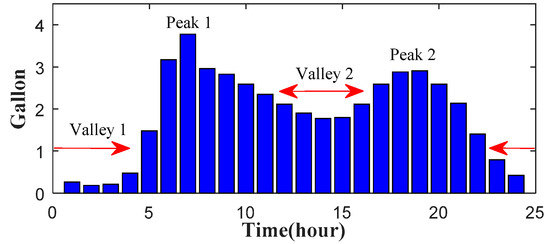 The optimization of EWH energy management is based on water demand pattern recorded in [31]. The 24-h water demand pattern of a typical household is shown in Figure 8. It has two peaks at Hours 7 and 19 and two valleys at Hours 2 and 14. The day-ahead electricity price is based on data from [23].