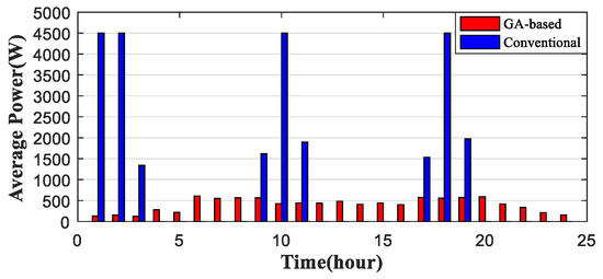 Figure 9 shows the comparison of EWH power consumption solution between GA-based and conventional methods in a 24-h simulation. It is clear that GA-based algorithm reduces the overall EWH load greatly. Due to the demand forecast, the proposed GA-based algorithm scheduled the power consumption solution just to reach the requirement and saved a lot of energy compared with conventional solution. It also shifts some portion of the peak load to the valley hours between Hour 1 and Hour 5 when the electricity price is low. For conventional control regardless of demand and the price, it shows several peak load hours, such as Hours 1, 2, 10 and 18.