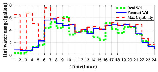 Besides finding the power consumption solution with minimum cost, we would like to make sure that the comfort experience of the customer is not affected, i.e., the maximum capability of the EWH, , can meet the hot water demand of the customer. In Figure 10, the real hot water demand from residents, shown in Figure 8, is redrawn by the green dotted line in this figure; the forecasted hot water demand, generated using the ARIMA model shown in Section 4.1, is shown in the blue line; the red dotted line represents the maximum capability of the hot water that can be provided at a given time slot and is calculated based on the Supply-Consume model presented in Section 3. In Hour 9 and Hour 16, there are, respectively, 0.189 gallon and 0.351 gallon of hot water shortage. This is due to the error in water demand forecast. In these two time slots, the maximum hot water capacity generated using the proposed Supply–Consume model is above the forecasted water demand generated using the ARIMA model, demonstrating the effectiveness of the proposed method in general. However, the maximum hot water capacity is a little bit below the real hot water demand represented by the green dotted line due to the prediction error between the actual and forecasted water demands, indicating that improvement is needed in the water demand forecast. Even so, the prediction and actual water demand patterns are properly matched with each other in Figure 10. Since none of the existing forecast technologies can guarantee 100% forecast accuracy, and also the shortage calculated in Figure 10 is less than 7% of the overall daily hot water usage, it is reasonable to assume that this hot water shortage is negligible. Hence, the solution generated using the proposed method is a valid solution to maintain the overall comfort of customers. Note that the learning and GA-based optimization approach works in a 24-h frame, i.e., there is no consecutive optimization between two consecutive days. As a result, in the late-night hours starting at 10:00 p.m., the power decreases, as there is no further known usage of hot water from the next day.