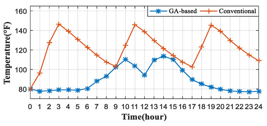 In addition, the comparison of the tank temperature is shown in Figure 11. For GA-based model, the tank temperature is always lower than the conventional one because of the optimized power solution. It rises only according to the demand of the customer and a huge amount of energy can be saved.