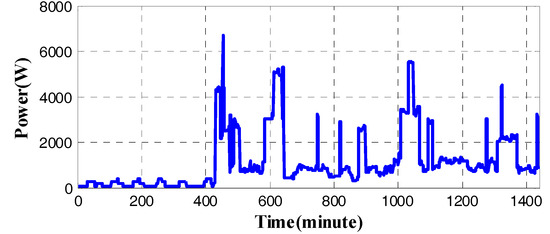 To evaluate the impact of the proposed EWH mechanism to the residential power system, an overall demand load pattern is considered. The residential load pattern is simulated using a domestic electricity demand model provided in [33], and the load of water heater is excluded from the pattern. The demand of a residential house with five residents was simulated for a weekday in October. The load pattern is shown in Figure 12, in which we can see that, without EWH, there are already several peak hours. The results of Figure 12 matches with the discussion presented in Section 4, which shows that, during the active hours of residents, the demand is high while in midnight, the demand is low.