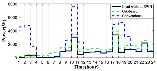 For the conventional EWH power consumption pattern shown in Figure 9, the usage peaks appear at similar peaks, as shown in Figure 12, since the EWH usage also happens in the active hours of residents. However, the peak hours of the GA-based EWH solution are shifted to the non-peak hours of other appliances. This is demonstrated by Figure 13, which shows the overall load pattern including EWH. In Figure 13, the solid black line is the total load pattern without EWH which is the same as that shown in Figure 12. By adding the conventional and GA-based power consumption patterns shown in Figure 9 to the black line, respectively, the overall residential load patterns are shown by the green dotted line and blue dotted line in Figure 13. In the load pattern using the conventional EWH method (green dotted line), the load peak is added with the other load peak in Hours 10 and 17–19, while, in GA-based load pattern (blue dotted line), the peak reduces.