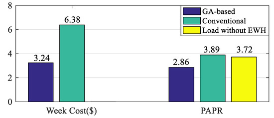 The comparison of PAPR and weekly cost using conventional and GA-based EWH is shown in Figure 14. The conventional EWH has a PAPR of 3.89. The GA-based EWH has a PAPR reduced to 2.86. For comparison, the PAPR without EWH load is also shown in Figure 14, which is 3.72. PAPR is largely reduced after the learning and GA-based optimization compared to the DSM result using a Vickrey-Clarke-Groves mechanism in an earlier study [34]. The daily average power for GA-based DSM and conventional model are 633.6 W and 1089.1 W, respectively, showing that the new scheme has a considerable energy saving.