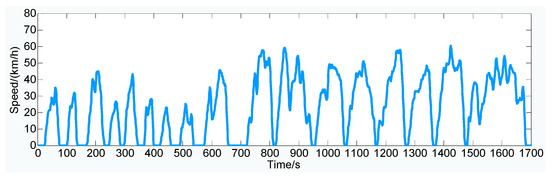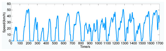 The battery capacity meeting the requirements of the endurance mileage can be calculated by Equation (9) (which was found to be 254 Ah in this study). This study assumed that the battery pack terminal voltage is 380 V, the battery capacity is 2.6 Ah, and the nominal voltage of the battery is 3.6 V. Moreover, the cells inside the battery pack were 106 in series and 98 in parallel. It was also assumed that all the cells have the same characteristics. Therefore, the output current of the cell (Icell) can be calculated by Equation (10).