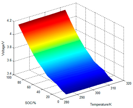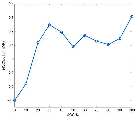 The internal resistance of the battery in Equation (12) can be obtained by the hybrid pulse power characterization (HPPC) test [22]. The entropy coefficient can be obtained by the following method [23,24]: the battery open circuit voltage (UOCV) is measured under fixed SOC (state of charge) conditions and different ambient temperature, and the relation between UOCV, Ts, and SOC is shown in Figure 5. In this study, the open circuit voltage of the battery was measured under different SOC values at 10, 20, 30, and 40 °C. Then, the entropy coefficient can be obtained by fitting a function of the ambient temperature (Ts) and open circuit voltage (UOCV) at a specified SOC, where the slope of the function is the entropy coefficient. Figure 6 shows the change in the entropy coefficient with the SOC.