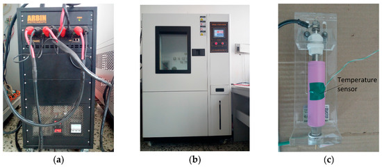 The experimental facility. (a) Arbin battery test system; (b) Thermostat; (c) Temperature measuring.