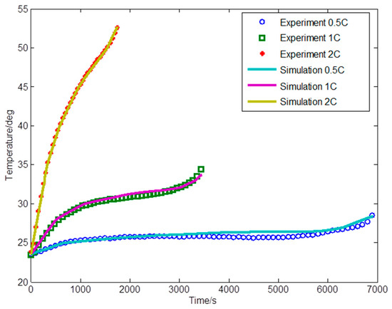 In this study, the battery was fully charged by the 0.3C constant current–constant voltage (CCCV) model at ambient temperature (25 °C), and then the constant discharge test was carried out at different rates (0.5C, 1C, and 2C) at the same temperature after two hours of standing. Next, the changes in the temperature of the battery were measured. The heat transfer coefficient of the test battery was obtained by fitting the curve of h versus temperature after the discharge and was found to be 20 W/m2K. Figure 8 shows the comparison between the experimental and simulation results of constant current discharge with different rates at ambient temperature (25 °C). Figure 8 shows that the experiment and the simulation were in good agreement, and the maximum error between the simulation and the experimental results was 0.88 °C. In addition, the temperature error was less than 1 °C, which indicates that the model can accurately predict temperature [21]. In order to verify the accuracy of the simulation model in the actual working conditions, the driving cycle experiment was tested at the same ambient temperature, and the output current of the cell used in regular lines was inputted in the model to simulate a battery that operates under the conditions of the regular lines cycles. The heat transfer coefficient of the testing battery (20 W/m2K) was obtained by fitting the h-T curve after discharge. Figure 9 shows the increase in the battery temperature and the errors between the experimental and simulation results under the operation conditions in regular lines. The absolute error was less than 0.3 °C, which indicates that the model can provide accurate temperature predictions.