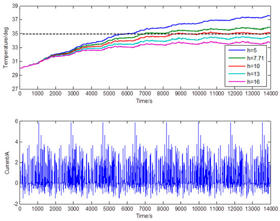 To ensure the battery is working properly during the actual operation, the operating temperature of the battery should be kept below 35 °C [7]. Figure 10 shows that the battery gradually reached a heat balance with the progression of time, and the temperature was stable at the end of the test. When h was 7.71 W/m2 K (natural convection), the temperature increased by about 7.5 °C, i.e., the temperature was more than 37 °C after eight cycles under the operation conditions of the regular lines. This means that the temperature rises quickly, and hence the natural convection cannot meet the cooling requirements of the batteries. Thus, to make sure the temperature of the battery is below 35 °C after eight cycles under the operation conditions of the regular lines, h should be more than 10 W/m2K.