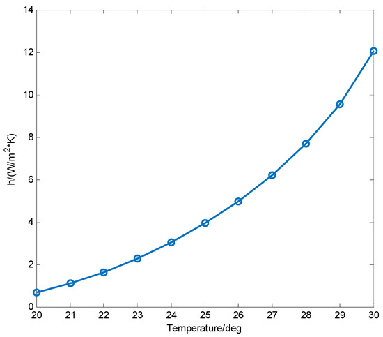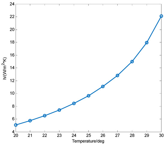 In this study, it assumes that the initial SOC of the battery is 90%. According to the thermal model developed in this study, the heat transfer coefficient that ensures the temperature of battery is below 35 °C after working for eight cycles under the operation conditions of the three Harbin bus lines can be obtained with different ambient temperature, as shown in Figure 11, Figure 12 and Figure 13. The data were fitted by the least squares method, to obtain the quantitative relationship between the optimum heat transfer coefficient and the ambient temperature of the battery under the operation conditions of the three Harbin bus lines, which are shown in Equations (20)–(22). Figure 11 and Equation (20) show that natural convection can meet the cooling requirements of the batteries under the regular lines when the ambient temperature is below 28 °C, while when the ambient temperature is 30 °C, the heat transfer coefficient should be at least 12 W/m2K. Figure 12 and Equation (21) show that when the ambient temperature is below 23 °C, the natural convection can meet the cooling requirements of the batteries in the BRT lines, while when the ambient temperature is 30 °C, the heat transfer coefficient should be at least 22 W/m2K. Figure 13 and Equation (22) show that when the ambient temperature is below 20 °C, the natural convection can meet the cooling requirements of batteries under the operation conditions of the suburban lines, while when the ambient temperature is 30 °C, the heat transfer coefficient should be at least 32 W/m2K.