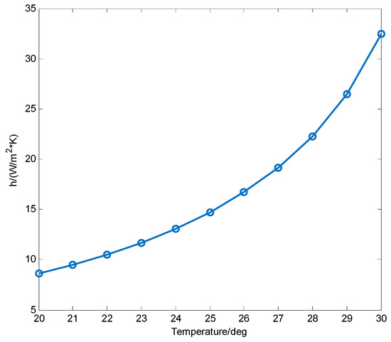 From the simulation results of COMSOL it can be seen that, when the ambient temperature is 30 °C, the temperature rise of the battery is related to the heat transfer coefficient of the battery and the number of cycles. Therefore, the temperature rise can be expressed as a function of the number of cycles (c) and the heat transfer coefficient (h), as shown in Equation (23).
