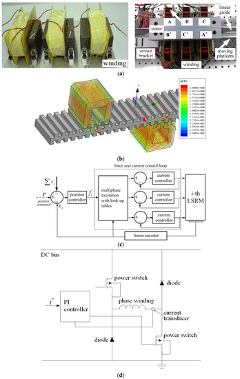 Figure 1a is the winding and the LSRM picture. Figure 1b is the flux contour from the finite element analysis for any one phase and it clear that each phase can be controlled independently [4]. The control block diagram for any LSRM node can be depicted as shown in Figure 1c. The i-th LSRM node receives both the position feedback information from its linear encoder and the j-th node and only the leader node accesses the position reference information. Each node is composed of a local position controller, the multiphase excitation scheme with look-up table linearization, current controllers to form the force and current control loop, and an LSRM [22]. For the i-th LSRM node, error is decided from the difference between reference (the leader only) and actual position xi of the i-th LSRM, along with the position information from the j-th LSRM xj. The position controller then calculates the control input and the multi-phase excitation with a look-up table linearization scheme determines the current command for the k-th phase, according to the current position of the i-th LSRM. Then the current controller outputs the actual current to the k-th winding. Figure 1d is the power electronics drive topology.