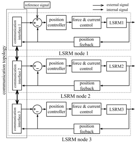 The hardware frame of the LSRM network composed of three LSRMs is depicted in Figure 3. Communication between the LSRM nodes is realized by the serial port with an RS232 protocol with a baud rate of 57,600 and the data and stop bit set are eight and one, respectively. “External signals” represent the neighbors’ position information and also the reference signal for LSRM node 1. “Internal signals” are the position information within the nodes.