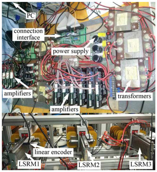 As shown in Figure 4, each LSRM node is composed of the LSRM, the power supply with transformers and the dSPACE control board and the connection interface. Current control is realized by three commercial amplifiers that are capable of inner current regulation of 20 kHz switching frequency based on the proportion integral algorithm, according to Figure 1c. The sampling frequency of the position control loop is 1 kHz.