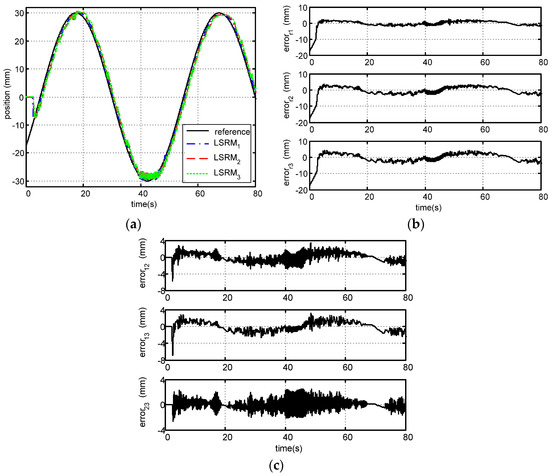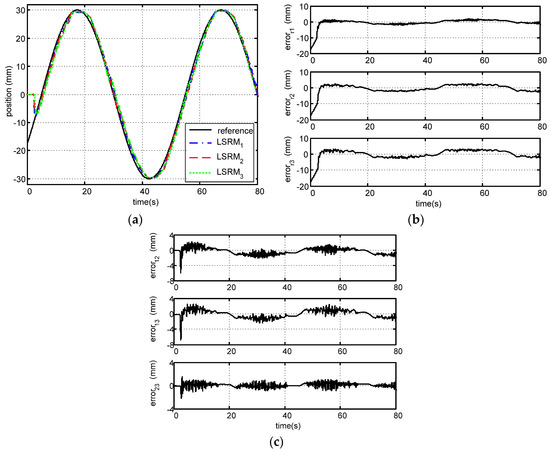 The experimental tracking response waveforms for the three LSRMs without leader-based feedback can be found in Figure 5. According to the tracking profiles of the three LSRMs in Figure 5a, the LSRMs are all capable of following the position reference signal.