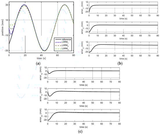 Tracking profiles (a) LSRMs; (b) error response to reference; and (c) relative error response between LSRMs with leader-based feedback.