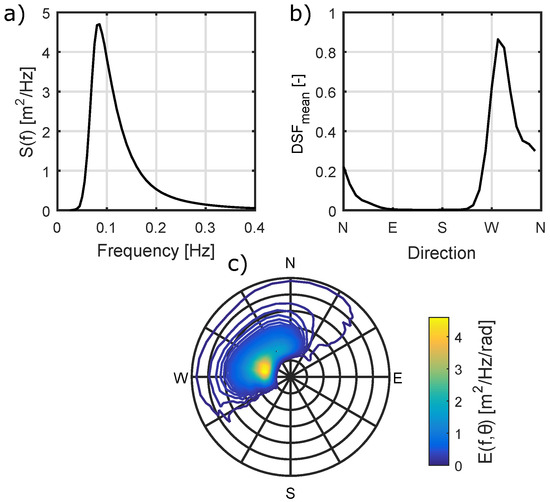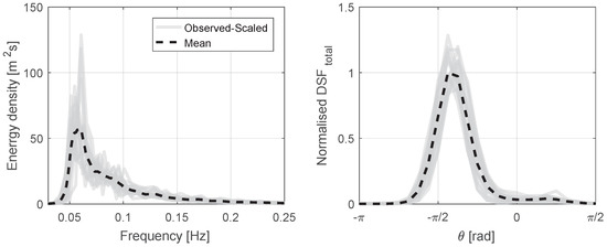 The frequency spectra, in combination with directional Fourier coefficients, have been used to estimate the directional distributions required in this analysis. This process is described in Section 2.2. The calculated mean frequency and directional spectra for the site, along with the mean weighted directional spreading function () is shown in Figure 1. Mean values of and are 2.05 m and 8.33 s respectively, with the most energetic recorded sea state having a of around 11.5 m, and of 15 s.