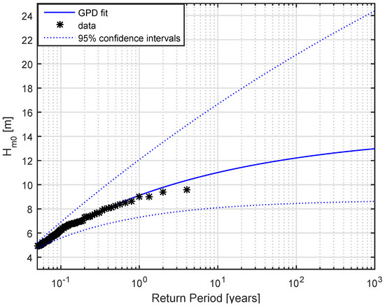 Choosing the appropriate threshold for the POT analysis is a trade-off between bias and variance and must be small enough to ensure there are sufficient points to determine the GPD parameters, but also must be large enough so that the data is truly capturing extreme events, and as such converges to a GPD [23]. Based on the stability parameter defined in Caires [3] a threshold of 4 m was eventually chosen, considered large enough as to only consider extremes but include a sufficient number of points, while being associated with a ‘stable’ region, and with a high associated value. The final GPD distribution with the 4 m threshold is shown in Figure 3, with the observed data overlaid.