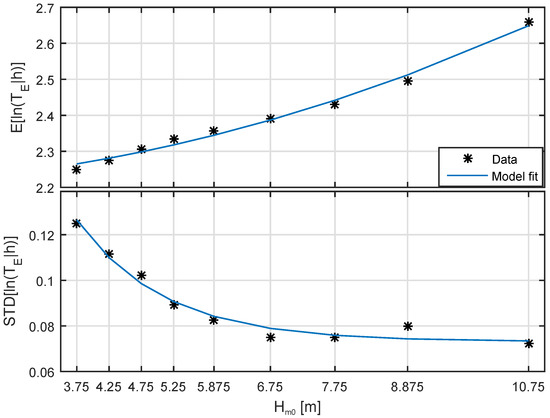 As mentioned in Section 1, to define extreme sea states effectively, appropriate wave period values are required. Log-normal distributions have been shown to effectively describe wave period distributions by Burrows and Salih [24], and therefore a parametrised conditional log-normal distribution has been fitted to values of energy period similar to Berg [7]. The parameters have only been fitted for values roughly corresponding to those above the POT threshold, under the assumption that there may be a different relationship between wave period and extreme wave heights than for the total dataset. Bin sizes for the parametrisation are also increased for large values of , to ensure there is enough data in each bin to get meaningful standard deviations. The resulting fit is shown in Figure 4, with the log-normal parametrisation described by Equations (4)–(7).