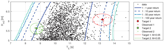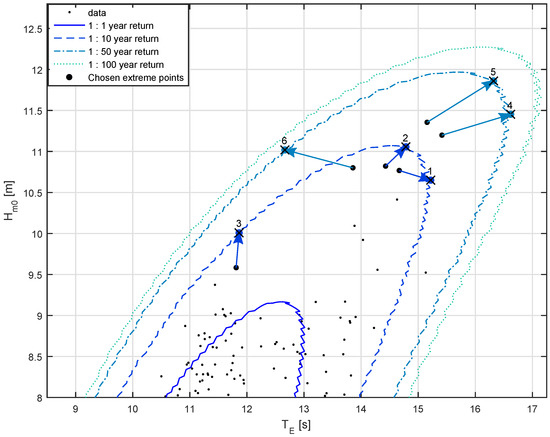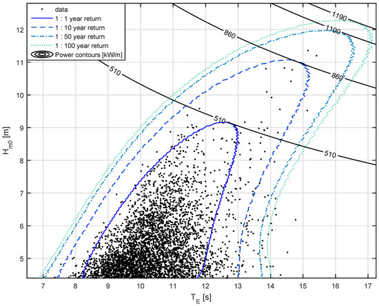 Various points have been chosen for 1:10 and 1:50 year extremes, to serve as an example cases for further analysis. The 1:10 year extremes are used as example extreme conditions which prototype devices may be subject to, with short deployments of a couple years. Extreme 1:50 year events will be more representative of full deployment lifetimes in the region of 20 years or more, as recommended by the International Electrotechnical Commission: IEC 61400-3 for offshore wind turbines [29], IEC 62600-2 for marine energy converters [30], and used in Ruiz [31] and Valamanesh et al. [32]. Points have been chosen corresponding to locations on each contour for maximum energy period, maximum power (normally maximum as well), and minimum above a threshold (10 m for 1:10, and 11 m for 1:50). The conditions specified, in combination with the extreme contours, define the combined extreme – values. These are shown in Table 1 and are highlighted in Figure 6. In this figure the closest unique observed data points are also highlighted, whose spectra are scaled to the desired – values in Section 2.2.2.