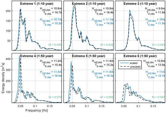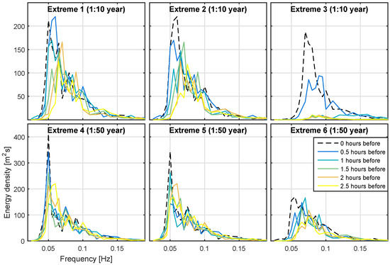 Observed spectra were used to define the test conditions. In order to ensure they matched the defined – values they were amplified () and shifted (). The resulting alteration to observed spectra are shown in Figure 7. This process is clearly only reasonable for small shifts in and . It is noted, however, that variation in observed spectral shapes over short time-frames (30 min) are many times larger than the ones proposed here, suggesting that the magnitude of the applied transformations may be reasonable, if not physically representative of wave energy transfer mechanisms. This change in spectral shapes for the 3 h prior to each identified extreme point is shown in Figure 13. From this figure, it is evident that there are quite significant changes in both and over relatively short time-frames. This aids somewhat in putting the proposed changes to the observed spectra into perspective.