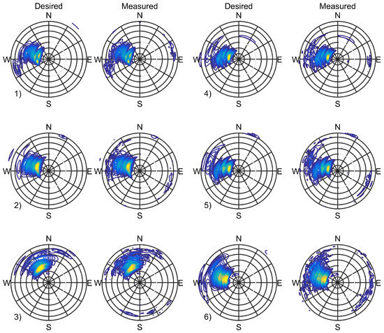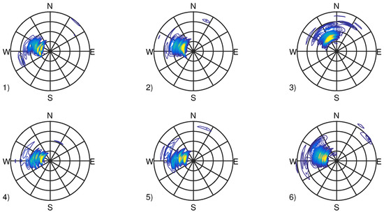 Directional spectra for identified extreme sea states, scaled to desired extreme conditions. 1) to 6) correspond to sea states 1 to 6 defined in Table 1.
