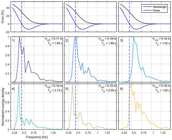 Extreme sea frequency spectra Froude scaled at 1:61. Resulting relative frequency dependent wavelength and power errors at this scale shown above. Dashed blue line indicated the frequency where power errors change sign (at this scale and depth ratio). 1) to 6) correspond to sea states 1 to 6 defined in Table 1.