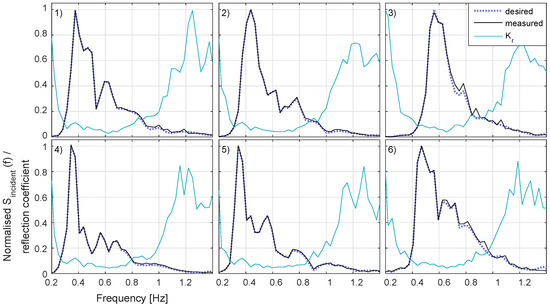 SPAIR incident frequency spectrum outputs for the extreme sea states, compared with desired. Shown with calculated frequency dependent reflection coefficients. 1) to 6) correspond to sea states 1 to 6 defined in Table 1.