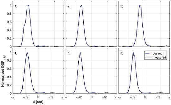 SPAIR method weighted DSF outputs for the extreme sea states, compared with desired. 1) to 6) correspond to sea states 1 to 6 defined in Table 1.