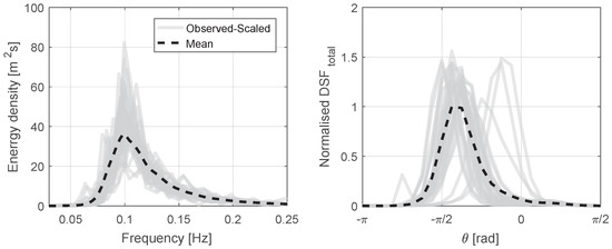 The selected sea states do not match the specified and values, and as such go through a scaling procedure. This required an amplification and a shifting in frequency. Noting that , Equation (13) can be used to get the correct by means of applying a single spectrum amplification factor. To obtain the correct , the whole spectrum is first interpolated to give a large number of frequency values. The spectrum is then shifted on the frequency axis until the desired is obtained. An iterative, rather than analytic, method was used here as is a function of i.e., to find the shift, the desired energy distribution would need to be known, which remains a function of the unknown frequency shift itself and the known spectral shape. The results from this scaling-shifting procedure for both the frequency and directional spectra are shown in Figure 7 and Figure 8 respectively. From Figure 8, it is evident that the resulting (observed) directional distributions are highly frequency dependent and would not have been obtained from a purely parametric approach to the sea state definition.