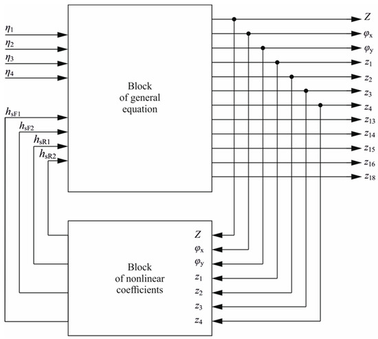 The model consists of a linear part, presented by the block of general equations and a nonlinear part, represented by the block of nonlinear coefficients (Figure 3). The inputs to this model were the four coordinates from road roughness, acting in the model as kinematic excitation (η1, η2, η3 and η4). The output of the model was the dynamic response of the system, as coordinates, Z, φx, φy (coordinates of the plate, representing car body itself), z1 … z4 (coordinates of the wheel hub), z13 … z16 (coordinates of the center of masses of the driver and three passengers, respectively), z18 (coordinate of center of mass of baggage in the baggage box). There were also some auxiliary coordinates, which were used to build the model. They had no influence on the dynamic behavior of the system.