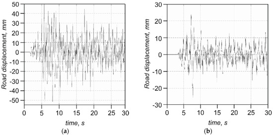 To generate the data for the model input, the experiments on roads of different roughness were performed (Figure 4). Road no. 6 showed displacement changes in the range of ±50 mm and road no. 3 showed displacement changes in the range of ±25 mm.