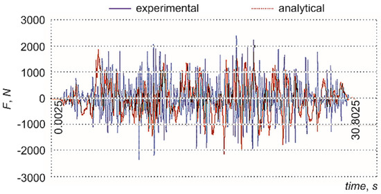 The experimental results (Figure 4) were compared with those of the theoretical model in Figure 5. The damping force from the measured suspension position, while driving at a speed of 60 kph on road no. 3, was calculated by Equation (1). The value of the damping coefficient in the model was the same as used in the car (hSF1 = 7500 Ns/m). It was found that root mean square (RMS) calculated from experimental data and the model, were in the same range—2000–2000 N.