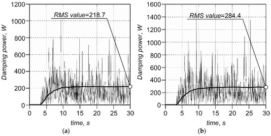 Damping power dependencies over time, obtained from the model for road no. 6: (a) Permanent damping with hSF1 = 7500 Ns/m; (b) Optimized damping law. RMS—root mean square.