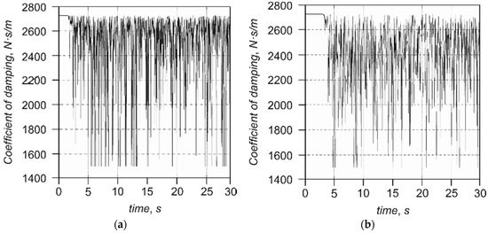 Coefficients of damping (hSF1) with optimized damping law dependencies, over time: (a) for road no. 6, P0 = 5765, P1 = −19, P2 = 0.5; (b) for road no. 3; P0 = 5050, P1 = 30, P2 = 0.45.