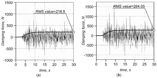 The damping force was calculated for each road with different roughness and different damping laws. It was found that for road no. 6, with permanent damping, the force RMS value was 301.5 N, while the optimized law RMS value was 410 N (Figure 9). For road no. 3, permanent damping gave a force of 218.9 N, while optimized damping gave 284.05 N (Figure 10). The results were similar to the harvested power: the optimized damping law had more influence on road no. 6, which was coarser than road no. 3. Chen et al. observed damping forces in the range of −600 to 600 N [46], while Cassidy et al. observed quite a high maximal force of 1 kN [45]. Our forces were calculated in RMS; therefore, they were a little bit lower compared to those measured by other authors. However, our maximal forces were in agreement with other research.