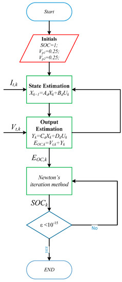 In [7], two resistor-capacitor (RC) networks are used to establish an equivalent circuit of the Li-ion battery model, and this model is parameterized using a numeric optimization method. In [8], the same model is used, but it recommended using more RC circuits in the model to increase the accuracy. In [9], a leakage resistance is added to the RC network in the battery model, and an experimental procedure is used to determine the internal resistance, leakage resistance, and the values of the RC elements. All of the previous articles considered that the model parameters are variable, but in [10], the model parameters of the Li-ion battery are considered constant from 20% state-of-charge (SOC) to 100% SOC, while the models have nonlinear behavior in the interval from 0% SOC to 20% SOC. The recent articles [11,12,13,14,15,16,17] discussed the uncertainty in the modeling, the nonlinear relation between open circuit voltage (OCV) and SOC, and the sensor noise. In [11,13], the fixed forgetting factor recursive least square estimator of Li-ion battery parameters was used to estimate the parameters with minimum error, but the change rate of each parameter to reach the true value was not taken into consideration, which leads to a poor estimation of the parameters.