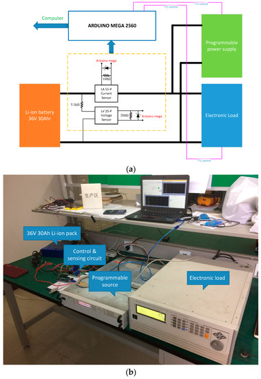 (a) Experiment layout for testing the battery; (b) Experiment test bench of Li-ion battery.