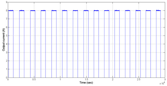 The pulsating current with constant amplitude (8 A) drawn by the electronic load.