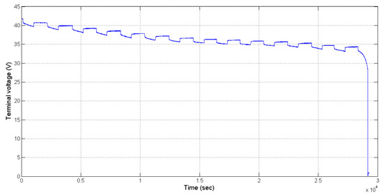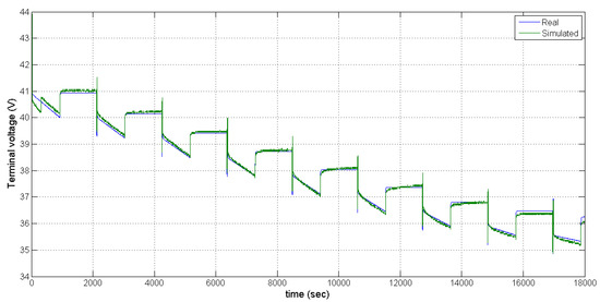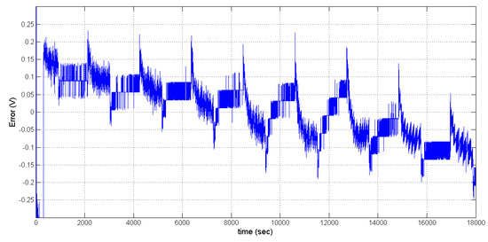 For validating the dynamic model of the Li-ion battery, the hybrid pulse power characterization (HPPC) test is employed, as in [15]. This test is used to determine power capability over the battery useable voltage range using a test profile that incorporates both discharge and charge pulses. In Figure 14, it is shown that the simulated model performance of the Li-ion battery matched the performance of the experimental setup, with a max error about ±0.2 V, as in Figure 15. These results show more accurate results than [15].