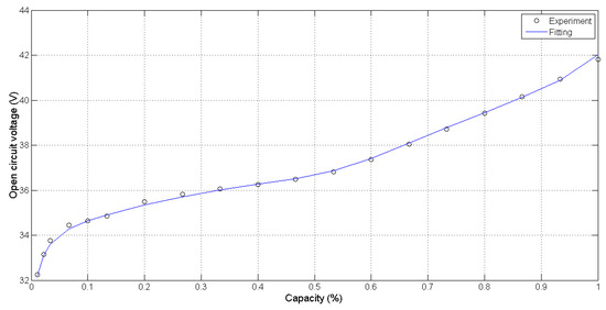 After the terminal voltage values are extracted under current pulsating test, the relationship between OCV and SOC can be estimated by applying Equation (9), and it is derived as: