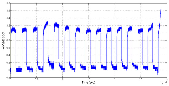 Fractional forms with various orders had been tried, but this particular form of E(SOC) was chosen to fit the experimental points with minimum error, and it is drawn as a fitted curve as in Figure 6 during the whole discharge period. From subtracting Figure 5 from Figure 6, vd can be easily calculated and drawn, as shown in Figure 7.