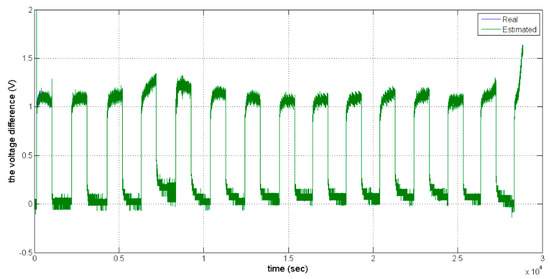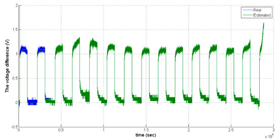 The second solution, which is based on establishing a vector of forgetting factors one for each parameter, to overcome the different change rate is also applied on the system. The vector mapping based on the correlation among the parameters is employed, and the estimated results are demonstrated in Figure 11. The error between the measured voltage and the estimated one reached at the end was less than 0.04 V, as in the previous technique, which is depicted in Figure 12. Consequently, the parameters converge to the true value, whenever the change rate of each parameter is different.