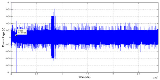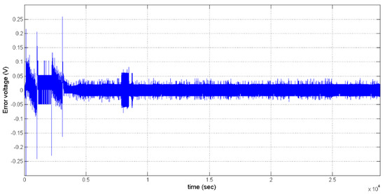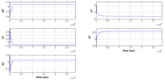 Due to the different change rates of each parameter to reach its true value, two solutions are proposed in Section 2.2 to estimate these parameters. The first solution, which is described as a variable forgetting factor recursive least square estimator, is applied on our system, and the estimation is converged as in Figure 8. The error in voltage between the measured voltage and the estimated one is less than 0.04 V most of the time, as depicted in Figure 9. In Figure 10, it is evident that all of the parameters converged to a steady state value.