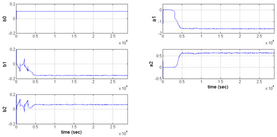As in [13], the discretized transfer function after the transformation is compared with Equation (5), and the dynamic model parameters are derived as: