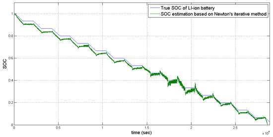 The estimation of SOC is based on Newton’s method, which is an iteration method. The advantage of using this method is avoidance of the effect of the measurement noise in the estimation process. Besides this advantage, the algorithm built based on this method estimates the state-of-charge with an acceptable error percentage around 3%, and a low computational cost, 6.3945 s, during the whole discharge period.