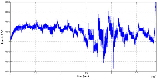 After validating the dynamic model with an acceptable error, a new methodology is proposed to estimate SOC independent on the noise. Its algorithm is shown in Figure 2, where it runs via the MATLAB environment. This method is applied on a 36 V 30 A Li-ion pack during the whole discharge period (T = 28,850 s), and pulsating current 8 A, as in Figure 16, which gives an error around 3% via the effective working period (20% SOC to 100% SOC), as shown in Figure 17. In [14], a comparative study among nonlinear Kalman filters (EKF, UKF, cubature KF (CKF) and PF) was established, which is applied on a UR18650A Li-ion cell. This comparative study discussed the computational cost and the root mean square error (RMSE) percentage in SOC estimation. The percentages of RMSE of SOC for different types of KFs are clarified in Table 1, where the error percentage is from 4.48 in EKF to 3.05 in PF.